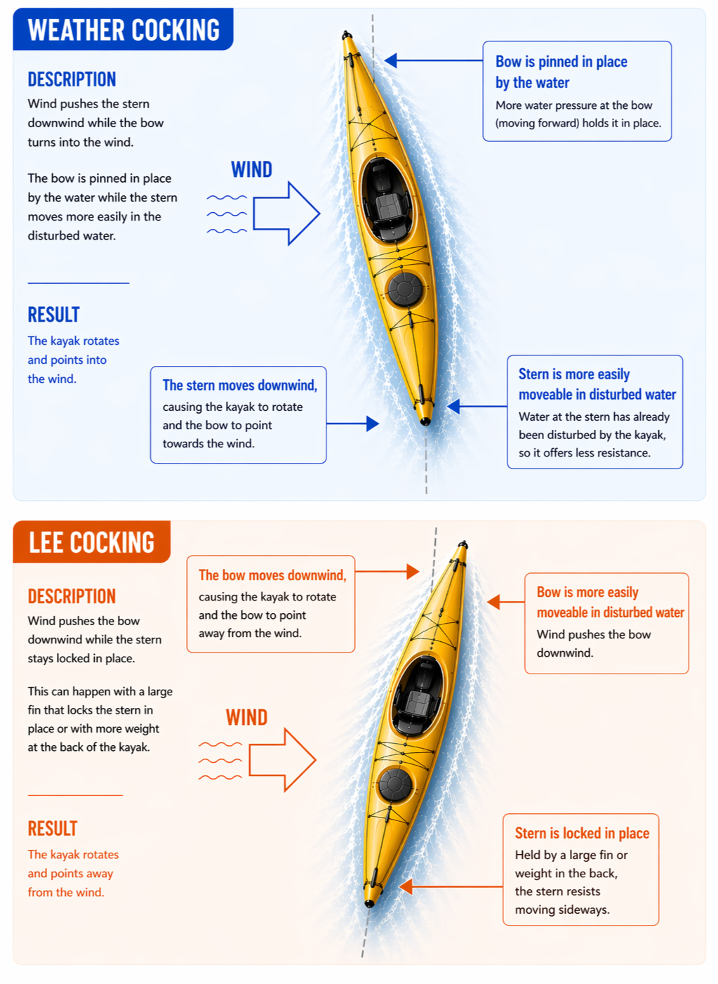 Weathercocking occurs when the stern is pushed slightly downwind while the bow turns into the wind. This happens because the bow usually has more water pressure, locking it in place, as it moves forward, while the stern travels through water that has already been disturbed by the front of the kayak. As a result, the stern tends to move sideways more easily when wind pushes against the kayak. As the stern drifts downwind, the kayak naturally rotates and the bow turns toward the wind.
