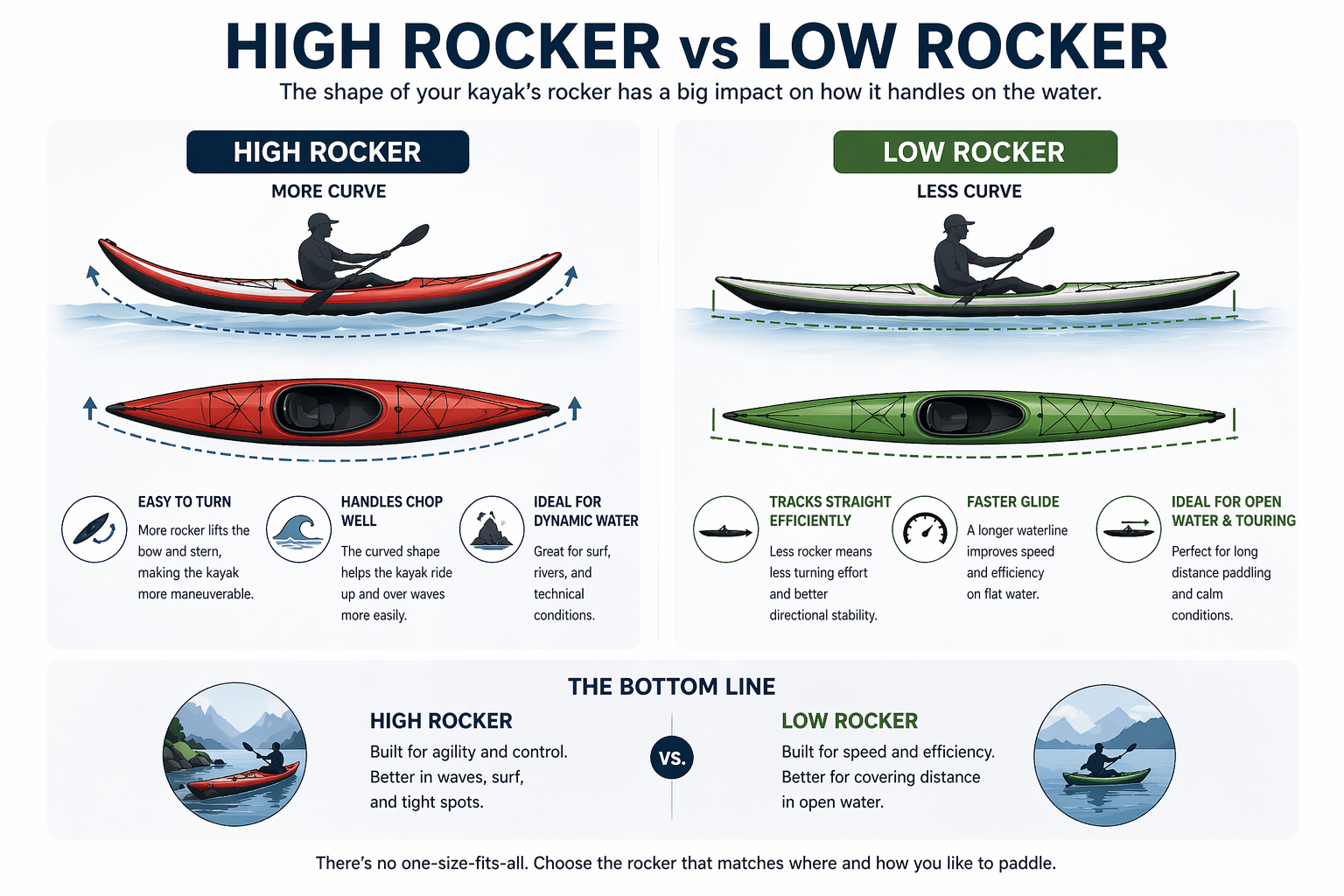 Designers use rocker carefully to balance tracking and maneuverability depending on the intended purpose of the kayak.