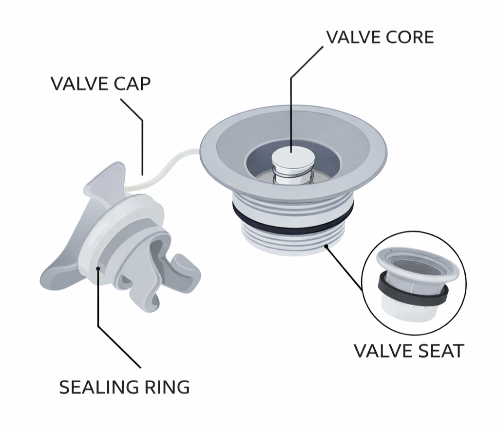 One of the first things we usually look at is the valves. Most well-built inflatable kayaks use a Halkey-Roberts (HR) style valve, which are user-friendly and designed to handle higher pressures and seal reliably once the kayak is inflated. If a kayak uses simple push-in valves like those found on air mattresses or beach inflatables, it’s a sign that it isn’t designed to operate at higher pressures.