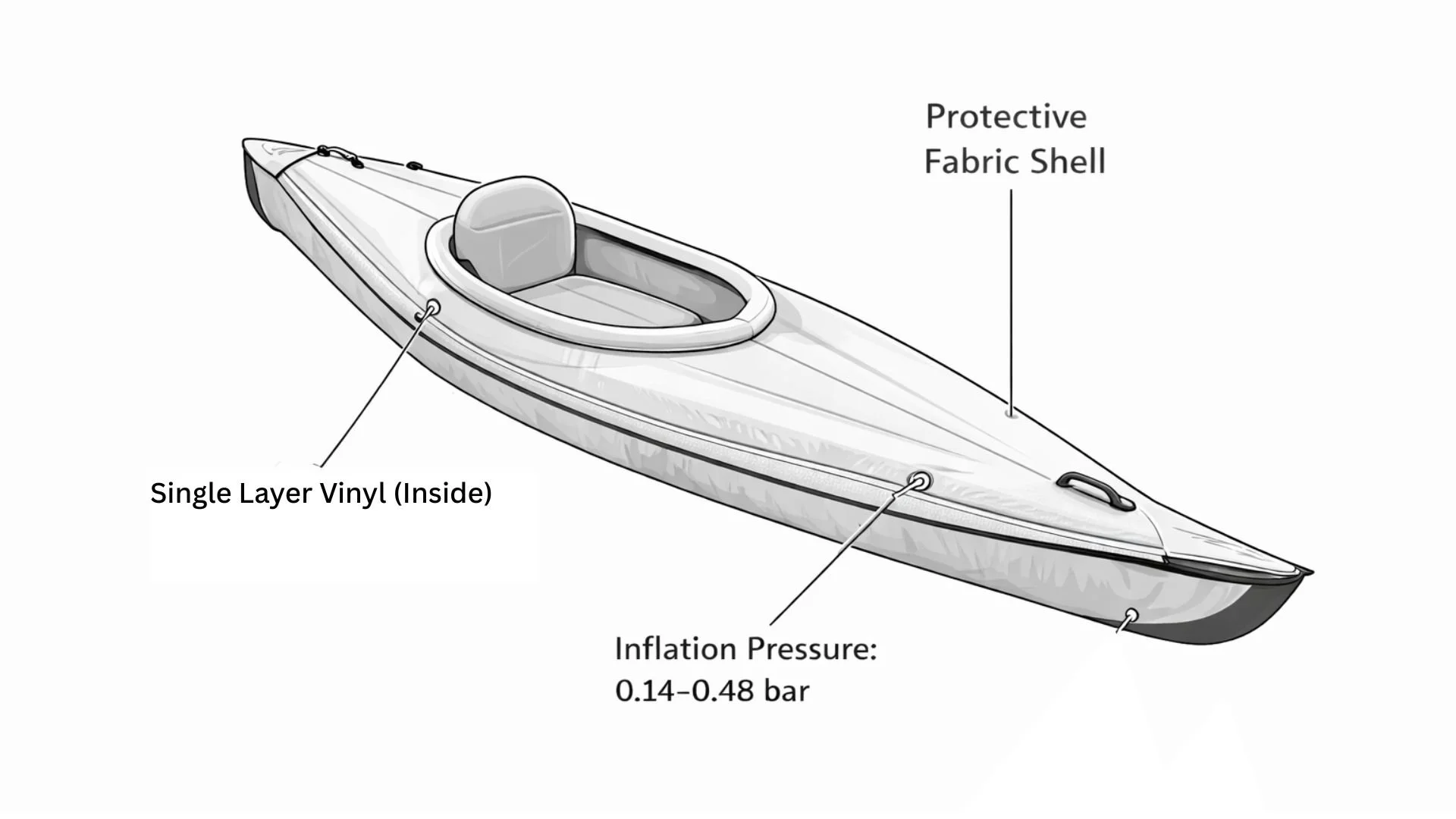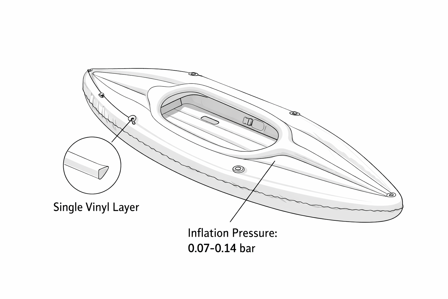Entry-level inflatable kayaks are usually made from single-layer vinyl and operate at fairly low air pressures, often somewhere around 0.07 bar.