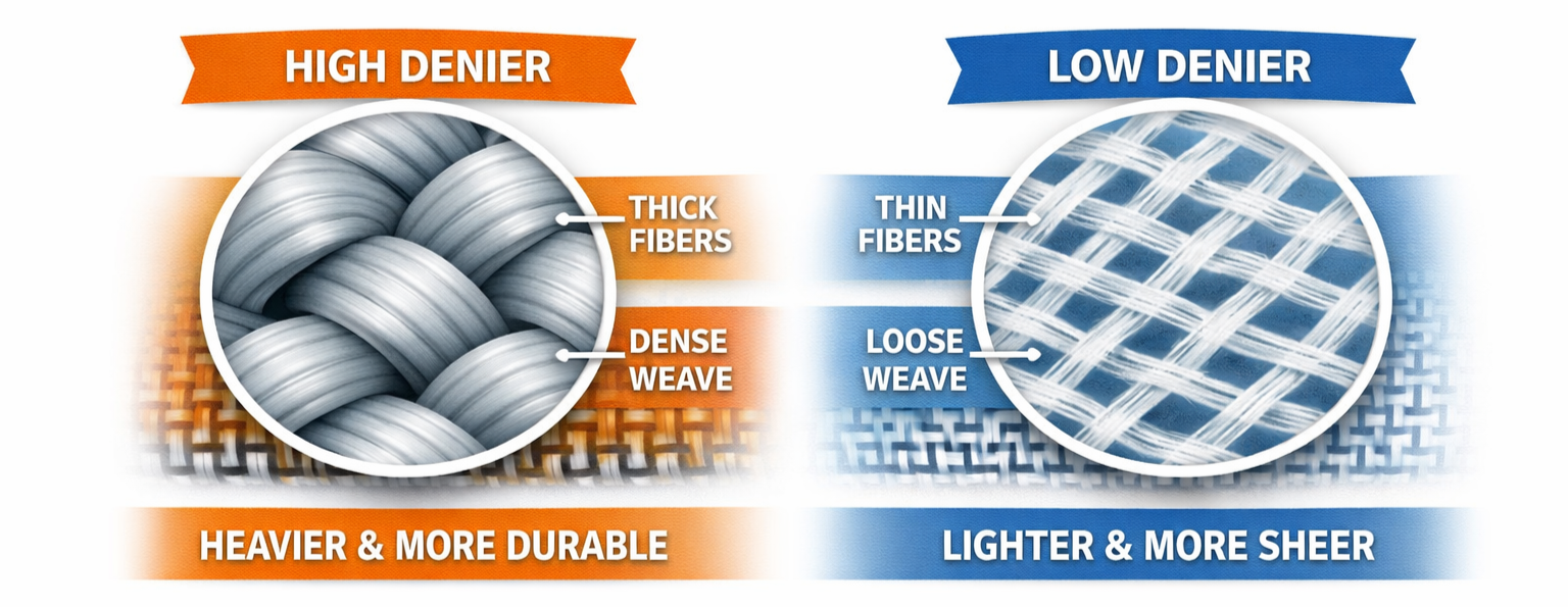 Denier is a measurement used to describe the thickness of fibres in a woven fabric. Technically, it refers to the weight in grams of 9,000 metres of fibre. Higher denier numbers indicate thicker fibres, which generally produce fabrics that are more resistant to tearing and abrasion.