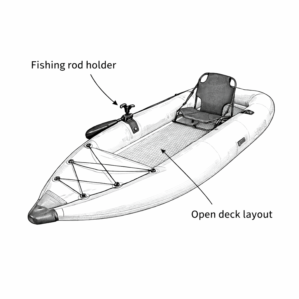 They commonly include open deck layouts, mounting points and space for rods, tackle boxes, higher seats and other fishing equipment. Efficiency is less of a focus, as the main goal is providing a steady platform for managing gear comfortably.